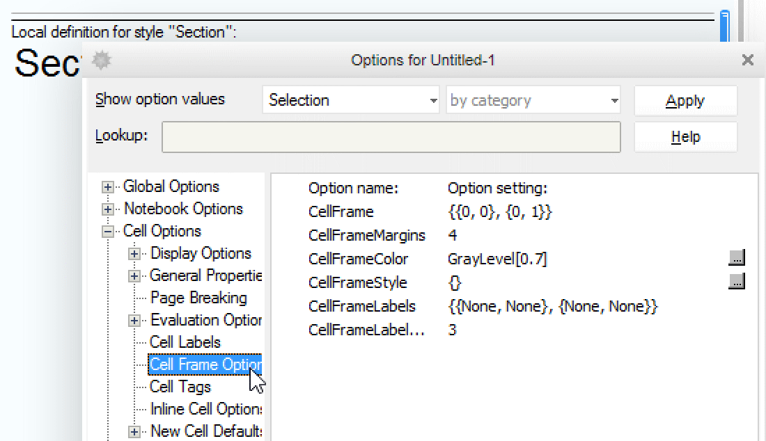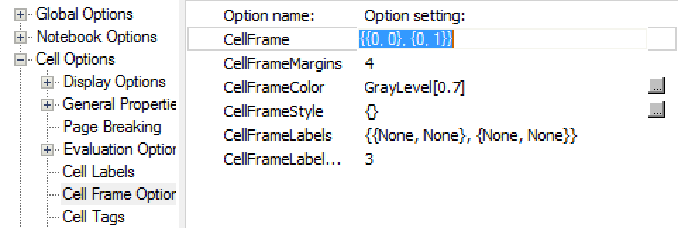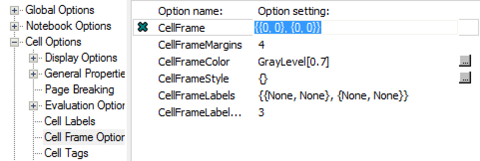 Besides the document interface menus, another more detailed method for changing settings is to use the Option Inspector. This is the only available interface for modifying the line above the Section cell. With the style cell still selected, choose Format ▶ Option Inspector to access Cell Options and CellFrame: