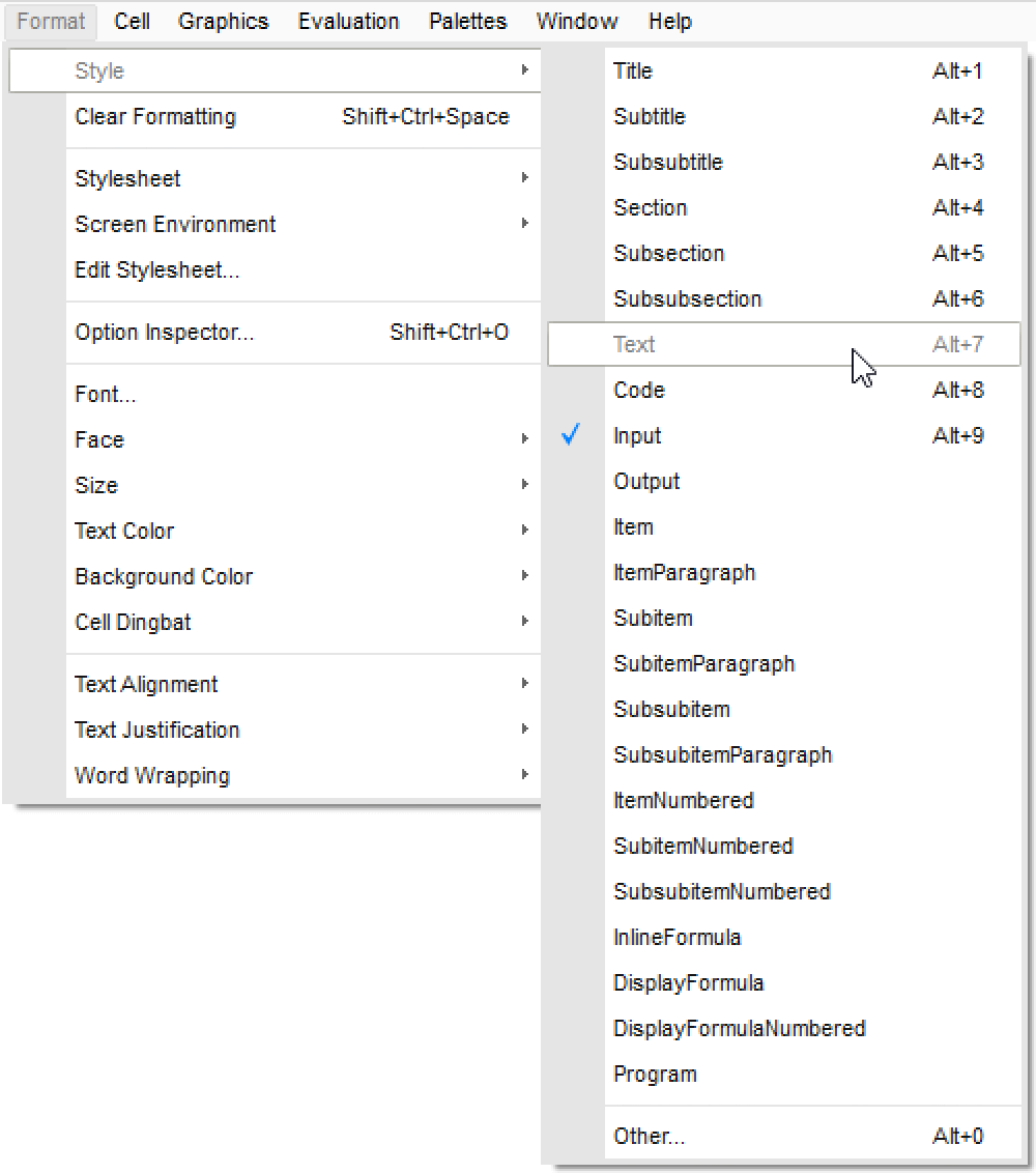 The default style of cells is Input; instead, you can create a cell containing text to add comments or descriptions of your programs. With an insertion point indicated by the horizontal cell insertion bar, create a new cell in the Text cell style from the Format ▶ Style menu, or use the keyboard shortcut indicated in the menu.