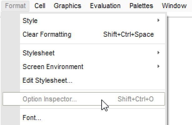 To display the timing of each evaluation in the lower-left corner of your notebooks, first open the Option Inspector by selecting Format ▶ Option Inspector, or by using the keyboard shortcut indicated in the menu: