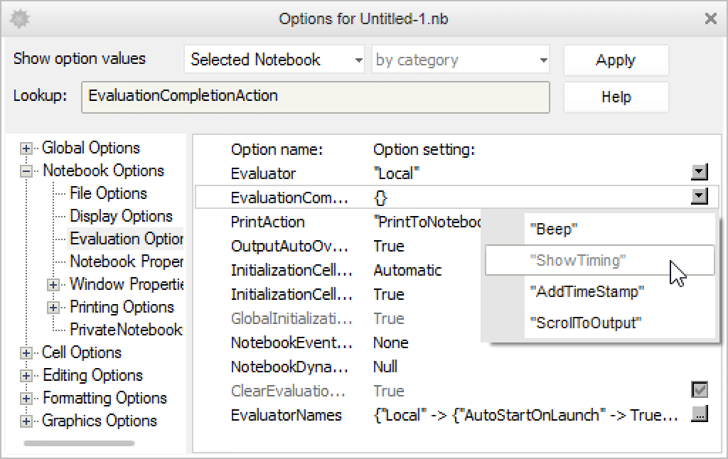 Next, expand Notebook Options and then select Evaluation Options. Within Evaluation Options, select "ShowTiming" from the drop-down menu next to EvaluationCompletionAction. Click Apply and then exit the Option Inspector: