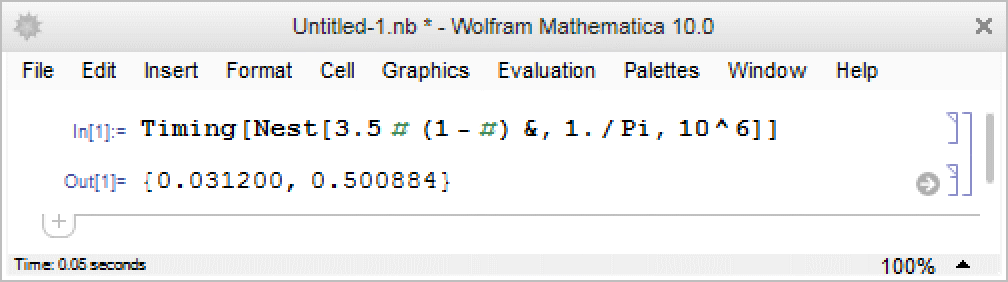 Now when you run a computation in your notebook, the timing of each evaluation is displayed in the lower-left corner of the window: