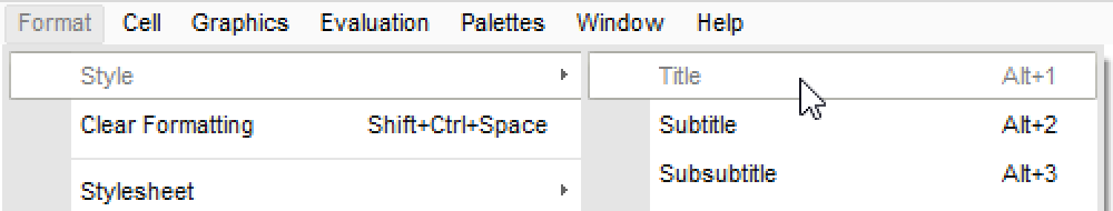 You can create title and section headings in a Wolfram System notebook by choosing the appropriate cell style in the Format ▶ Style menu. Add a Title cell to your notebook by choosing Format ▶ Style ▶ Title: