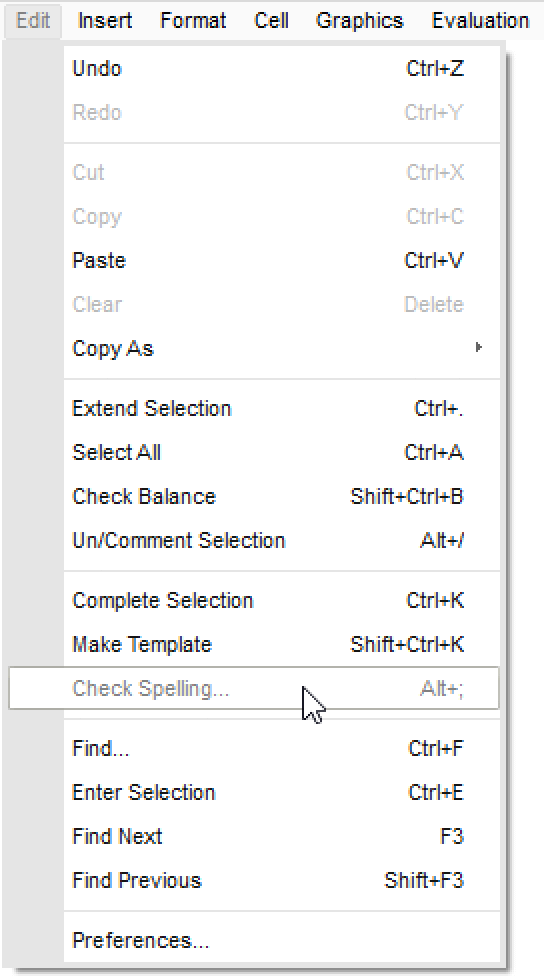 The Wolfram System also lets you check the spelling of text in your notebook. Start the spell checker by selecting the Edit ▶ Check Spelling menu item: