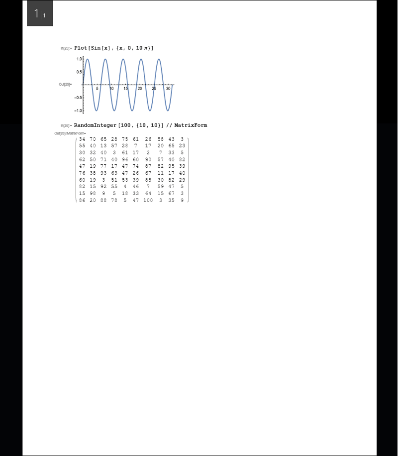 In this example, the notebook saved to PDF contains a plot and a 10×10 matrix of random integers. The magnification in the PDF viewer was lowered to show the whole document: