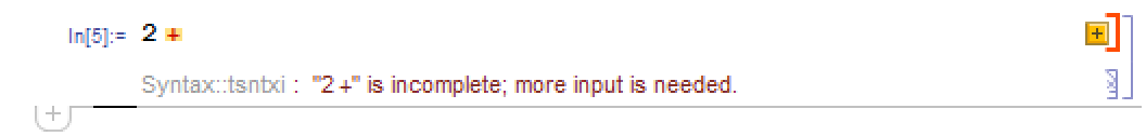 Evaluating a cell that contains a syntax error will add an error indication to the cell bracket, indicating a problem with the cell's content. You can click on the indicator to show the error messages, as was done in this screen shot: