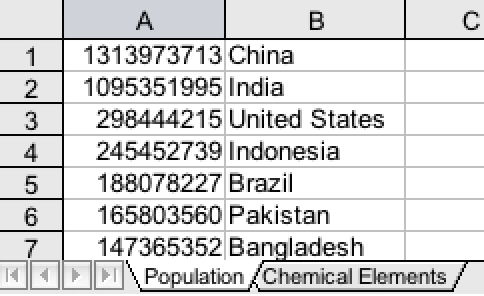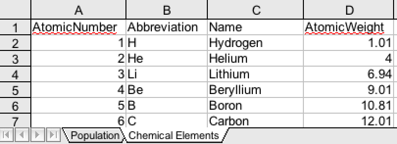Import the first sheet of data from the spreadsheets "population.xls" and "elements.xls" from the Wolfram Language documentation directory ExampleData: