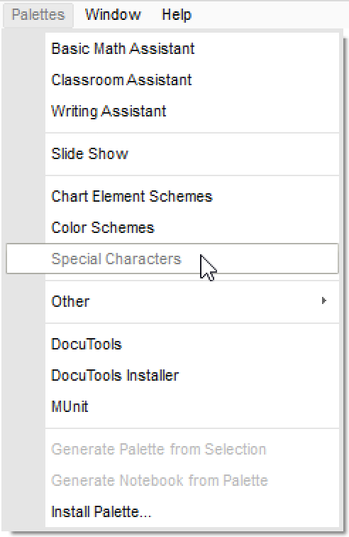 The Greek letters are also all listed on the Special Characters palette, along with their full names and primary aliases.