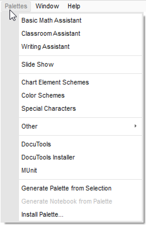 The Wolfram System provides immediate point-and-click access to many of its features through the Palettes menu. Here is a list of all the available palettes: