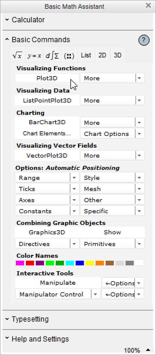 For example, if you forget the name or syntax of a 3D plotting function, instead of going to the help system you can go to the Basic Math Assistant and open the Basic Commands section. Clicking the appropriate function will insert a template for that function into your notebook: