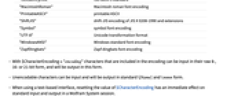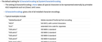 "AdobeStandard" Adobe standard PostScript font encoding "ASCII" full ASCII, with control characters "EUC" extended Unix code for Japanese "ISOLatin1" ISO 8859‐1 standard "ISOLatin2" ISO 8859‐2 standard "ISOLatin3" ISO 8859‐3 standard "ISOLatin4" ISO 8859‐4 standard "ISOLatinCyrillic" ISO 8859‐5 standard "MacintoshRoman" Macintosh roman font encoding "PrintableASCII" printable ASCII "ShiftJIS" shift‐JIS encoding of JIS X 0208‐1990 and extensions "Symbol" symbol font encoding "UTF‐8" Unicode transformation format "WindowsANSI" Windows standard font encoding "ZapfDingbats" Zapf dingbats font encoding - With $CharacterEncoding="encoding" characters that are included in the encoding can be input in their raw 8‐, 16‐ or 21-bit form, and will be output in this form.