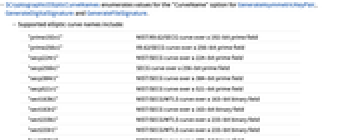- $CryptographicEllipticCurveNames enumerates values for the "CurveName" option for GenerateAsymmetricKeyPair, GenerateDigitalSignature and GenerateFileSignature.