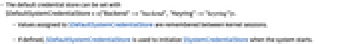 - The default credential store can be set with $DefaultSystemCredentialStore=<|"Backend"->"backend","Keyring"->"keyring"|>.