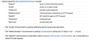 "Session" local or cloud interactive session "Script" script run in batch mode "Subkernel" parallel or grid subkernel "WebEvaluation" cloud evaluation initiated by an HTTP request "WebAPI" API called through an HTTP request "Scheduled" scheduled task "BatchJob" remote batch job - The "Script" environment is used by wolframscript for local script execution.