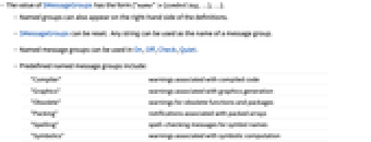 Wolfram Research (2008), $MessageGroups, Wolfram Language function, https://reference.wolfram.com/language/ref/$MessageGroups.html.