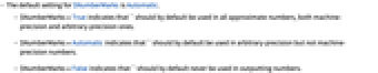 - $NumberMarks=Automatic indicates that ` should by default be used in arbitrary‐precision but not machine‐precision numbers.