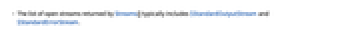 - The list of open streams returned by Streams[] typically includes $StandardOutputStream and $StandardErrorStream.