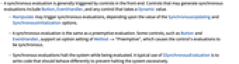 - A synchronous evaluation is generally triggered by controls in the front end. Controls that may generate synchronous evaluations include Button, EventHandler, and any control that takes a Dynamic value.