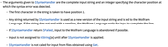 - The arguments given to $SyntaxHandler are the complete input string and an integer specifying the character position at which the syntax error was detected.