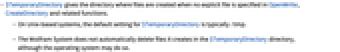 - $TemporaryDirectory gives the directory where files are created when no explicit file is specified in OpenWrite, CreateDirectory and related functions.