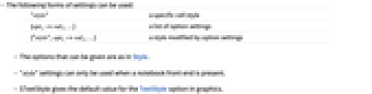 "style" a specific cell style {opt1->val1,…} a list of option settings {"style",opt1->val1,…} a style modified by option settings - The options that can be given are as in Style.
