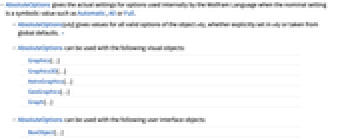 - AbsoluteOptions[obj] gives values for all valid options of the object obj, whether explicitly set in obj or taken from global defaults. »