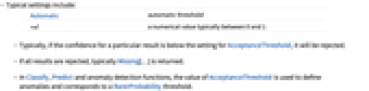 - In Classify, Predict and anomaly detection functions, the value of AcceptanceThreshold is used to define anomalies and corresponds to a RarerProbability threshold.