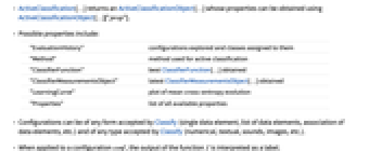 "EvaluationHistory" configurations explored and classes assigned to them "Method" method used for active classification "ClassifierFunction" best ClassifierFunction[…] obtained "ClassifierMeasurementsObject" latest ClassifierMeasurementsObject[…] obtained "LearningCurve" plot of mean cross-entropy evolution "Properties" list of all available properties - Configurations can be of any form accepted by Classify (single data element, list of data elements, association of data elements, etc.) and of any type accepted by Classify (numerical, textual, sounds, images, etc.).