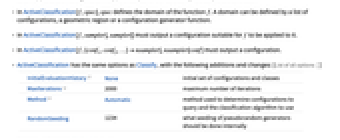- In ActiveClassification[f,spec], spec defines the domain of the function f. A domain can be defined by a list of configurations, a geometric region or a configuration generator function.
