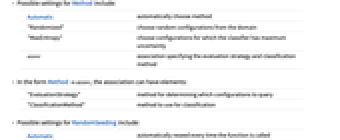 Automatic automatically choose method "Randomized" choose random configurations from the domain "MaxEntropy" choose configurations for which the classifier has maximum uncertainty assoc association specifying the evaluation strategy and classification method - In the form Methodassoc, the association can have elements: