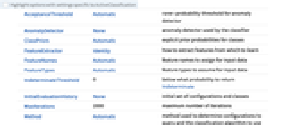 AcceptanceThreshold Automatic rarer-probability threshold for anomaly detector AnomalyDetector None anomaly detector used by the classifier ClassPriors Automatic explicit prior probabilities for classes FeatureExtractor Identity how to extract features from which to learn FeatureNames Automatic feature names to assign for input data FeatureTypes Automatic feature types to assume for input data IndeterminateThreshold 0 below what probability to return Indeterminate InitialEvaluationHistory None initial set of configurations and classes MaxIterations 2000 maximum number of iterations Method Automatic method used to determine configurations to query and the classification algorithm to use MissingValueSynthesis Automatic how to synthesize missing values PerformanceGoal Automatic aspects of performance to try to optimize RandomSeeding 1234 what seeding of pseudorandom generators should be done internally RecalibrationFunction Automatic how to post-process class probabilities TargetDevice "CPU" the target device on which to perform training TimeGoal Automatic how long to spend training the classifier TrainingProgressReporting Automatic how to report progress during training UtilityFunction Automatic utility as function of actual and predicted class ValidationSet Automatic the set of data on which to evaluate the model during training