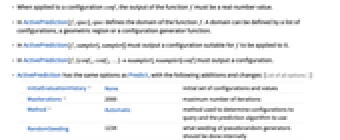 - In ActivePrediction[f,spec], spec defines the domain of the function f. A domain can be defined by a list of configurations, a geometric region or a configuration generator function.