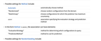 Automatic automatically choose method "Randomized" choose random configurations from the domain "MaxEntropy" choose configurations for which the predictor has maximum uncertainty assoc association specifying the evaluation strategy and prediction method - In the form Methodassoc, the association can have elements: