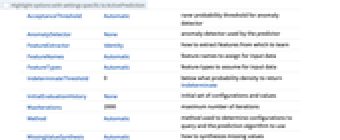 AcceptanceThreshold Automatic rarer probability threshold for anomaly detector AnomalyDetector None anomaly detector used by the predictor FeatureExtractor Identity how to extract features from which to learn FeatureNames Automatic feature names to assign for input data FeatureTypes Automatic feature types to assume for input data IndeterminateThreshold 0 below what probability density to return Indeterminate InitialEvaluationHistory None initial set of configurations and values MaxIterations 2000 maximum number of iterations Method Automatic method used to determine configurations to query and the prediction algorithm to use MissingValueSynthesis Automatic how to synthesize missing values PerformanceGoal Automatic aspects of performance to try to optimize RandomSeeding 1234 what seeding of pseudorandom generators should be done internally RecalibrationFunction Automatic how to post-process predicted value TargetDevice "CPU" the target device on which to perform training TimeGoal Automatic how long to spend training the classifier TrainingProgressReporting Automatic how to report progress during training UtilityFunction Automatic utility as function of actual and predicted value ValidationSet Automatic data on which to validate the model generated