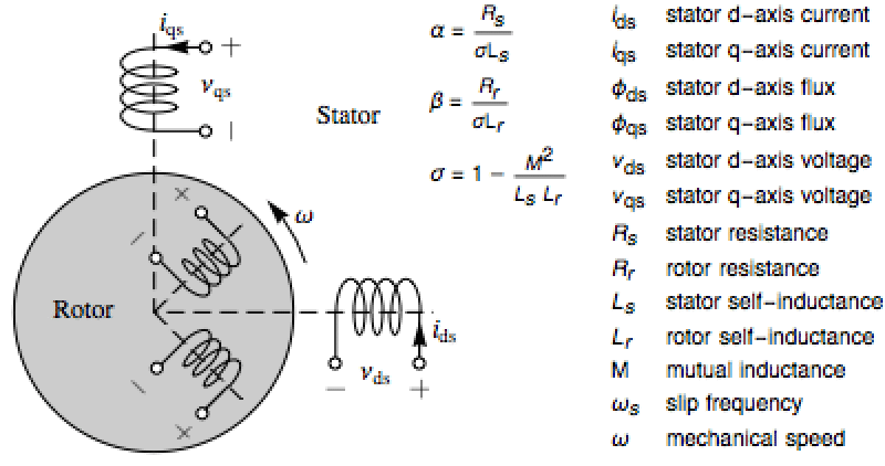 Model an induction motor in d-q (direct-quadrature) rotating coordinates, and use it to get a model with phase coordinates as output: »