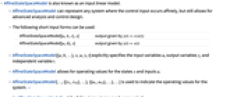 - AffineStateSpaceModel[…,{{x1,x10},…},{{u1,u10},…},…] is used to indicate the operating values for the system. »