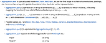 - AggregationLayer[f] operates on an array of dimensions {d1,…,dn} to produce a vector of size d1, effectively mapping the function f over a list of flattened subarrays of size d2×…×dn.
