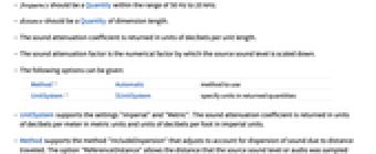 Method Automatic method to use UnitSystem $UnitSystem specify units in returned quantities - UnitSystem supports the settings "Imperial" and "Metric". The sound attenuation coefficient is returned in units of decibels per meter in metric units and units of decibels per foot in imperial units.