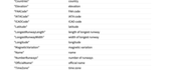 "AlternateNames" alternate names "Cities" city "Coordinates" coordinates "Countries" country "Elevation" elevation "FAACode" FAA code "IATACode" IATA code "ICAOCode" ICAO code "Latitude" latitude "LongestRunwayLength" length of longest runway "LongestRunwayWidth" width of longest runway "Longitude" longitude "MagneticVariation" magnetic variation "Name" name "NumberRunways" number of runways "OfficialName" official name "TimeZone" time zone "Uses" uses