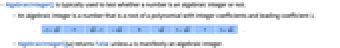 - AlgebraicIntegerQ[a] returns False unless a is manifestly an algebraic integer.