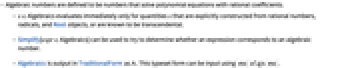 - Simplify[expr∈Algebraics] can be used to try to determine whether an expression corresponds to an algebraic number.