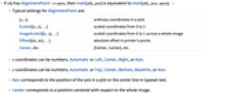 {x,y} ordinary coordinates in a plot Scaled[{x,y},…] scaled coordinates from 0 to 1 ImageScaled[{x,y},…] scaled coordinates from 0 to 1 across a whole image Offset[{dx,dy},…] absolute offset in printer's points Center, etc. {Center,Center}, etc. - x coordinates can be numbers, Automatic or Left, Center, Right, or Axis.