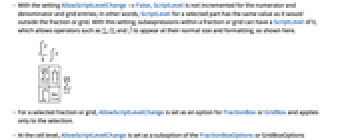 - With the setting AllowScriptLevelChange->False, ScriptLevel is not incremented for the numerator and denominator and grid entries; in other words, ScriptLevel for a selected part has the same value as it would outside the fraction or grid. With this setting, subexpressions within a fraction or grid can have a ScriptLevel of 0, which allows operators such as