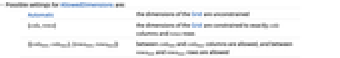Automatic the dimensions of the Grid are unconstrained {cols,rows} the dimensions of the Grid are constrained to exactly cols columns and rows rows {{colsmin,colsmax},{rowsmin,rowsmax}} between colsmin and colsmax columns are allowed, and between rowsmin and rowsmax rows are allowed