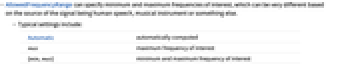 - AllowedFrequencyRange can specify minimum and maximum frequencies of interest, which can be very different based on the source of the signal being human speech, musical instrument or something else.