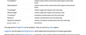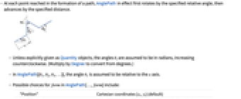 "Position" Cartesian coordinates {xi,yi} (default) "FrameMatrix" rotation matrix of the current frame with respect to the initial frame "RelativeMatrix" rotation matrix of the current frame with respect to the previous frame "FrameAngle" rotation angle with respect to the initial step "RelativeAngle" rotation angle with respect to the previous step "Translation" translation transformation from the initial step "Rotation" rotation transformation from the initial step "RotationTranslation" rotation-translation transformation from the initial step {form1,form2,…} list of forms - The arguments of AnglePath can be symbolic. They can also be Quantity objects.
