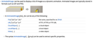 File["file"] or "file" file name, searched for on $Path URL["url"] or "url" HTTP, HTTPS or FTP URL CloudObject[…] a cloud object LocalObject[…] a local object Video[…] a video object - The syntax AnimatedImage[…][prop] can be used to extract specific properties.