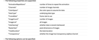 "AnimationRepetitions" number of times to repeat the animation "Channels" number of image channels "ColorSpace" the color space to assume for data "DataType" underlying data type "FrameRate" frame rate to use "ImageCount" number of images "ImageList" all images "Interleaving" whether data is stored interleaved "RasterSize" pixel dimensions of images "TotalDuration" the total duration "Transparency" whether the image has transparency (alpha) channel - The following options can be specified: