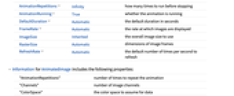 AnimationRepetitions Infinity how many times to run before stopping AnimationRunning True whether the animation is running DefaultDuration Automatic the default duration in seconds FrameRate Automatic the rate at which images are displayed ImageSize Inherited the overall image size to use RasterSize Automatic dimensions of image frames RefreshRate Automatic the default number of times per second to refresh - Information for AnimatedImage includes the following properties: