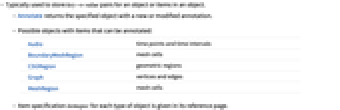 Audio time points and time intervals BoundaryMeshRegion mesh cells CSGRegion geometric regions Graph vertices and edges MeshRegion mesh cells - Item specification itemspec for each type of object is given in its reference page.