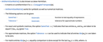 SameTest Automatic function to test equality of expressions Tolerance Automatic tolerance for approximate numbers - For exact and symbolic matrices, the option SameTest->f indicates that two entries mij and mkl are taken to be equal if f[mij,mkl] gives True.